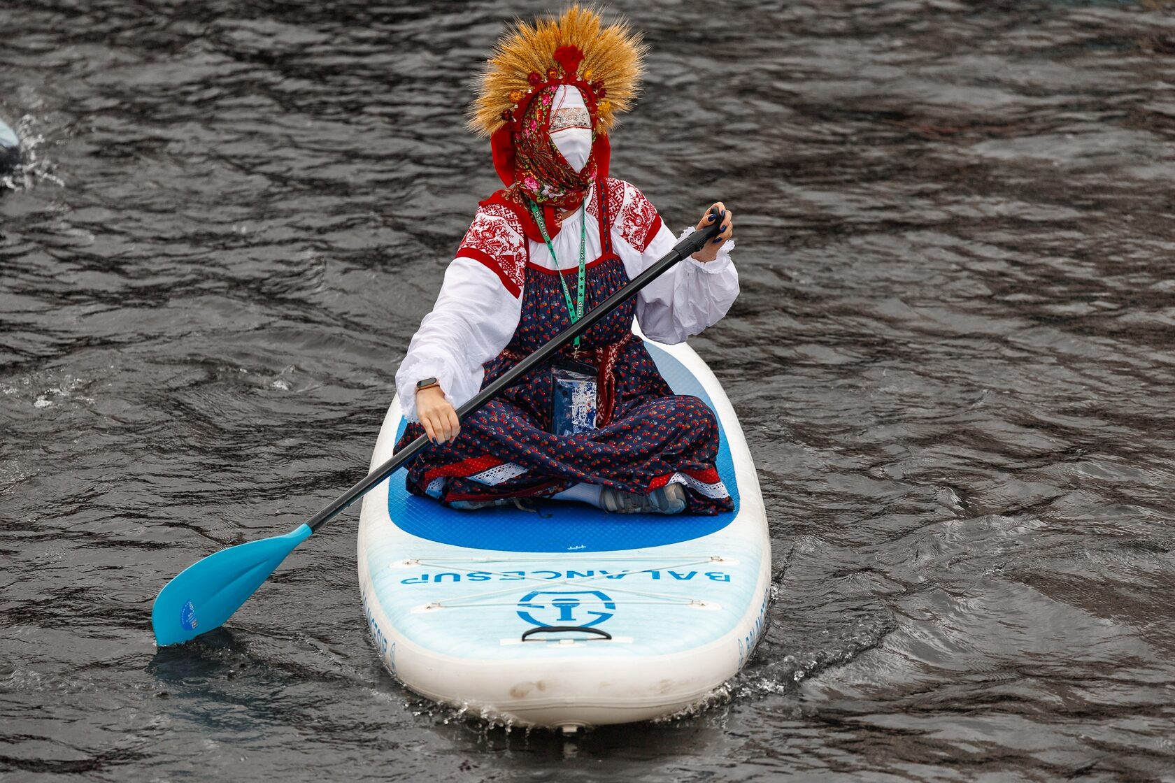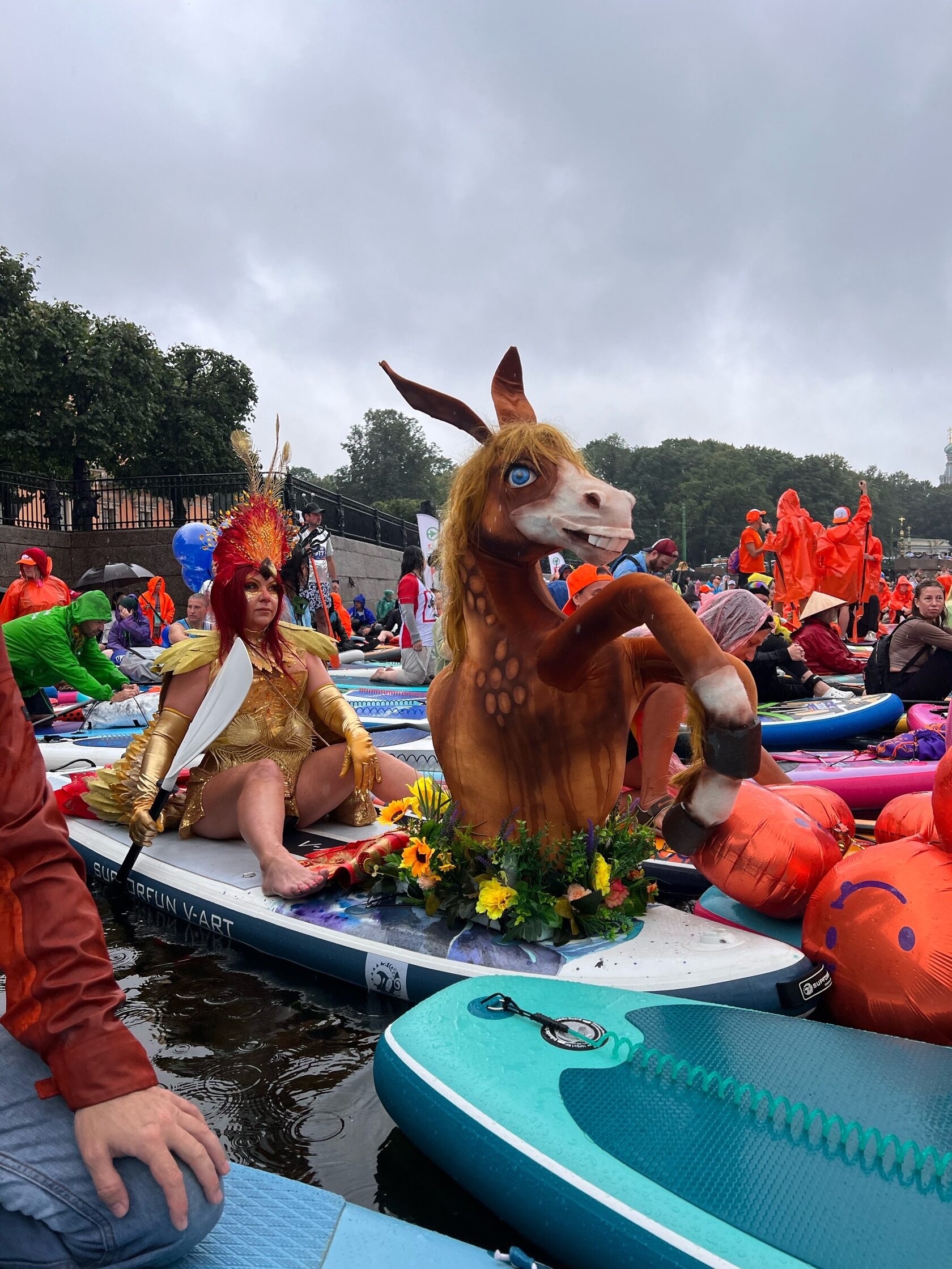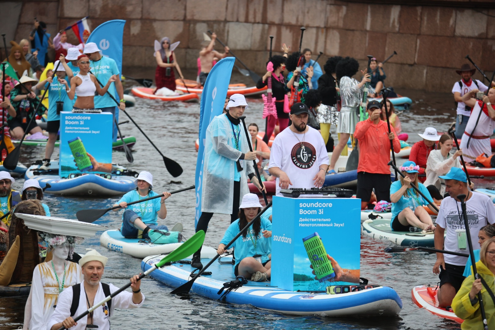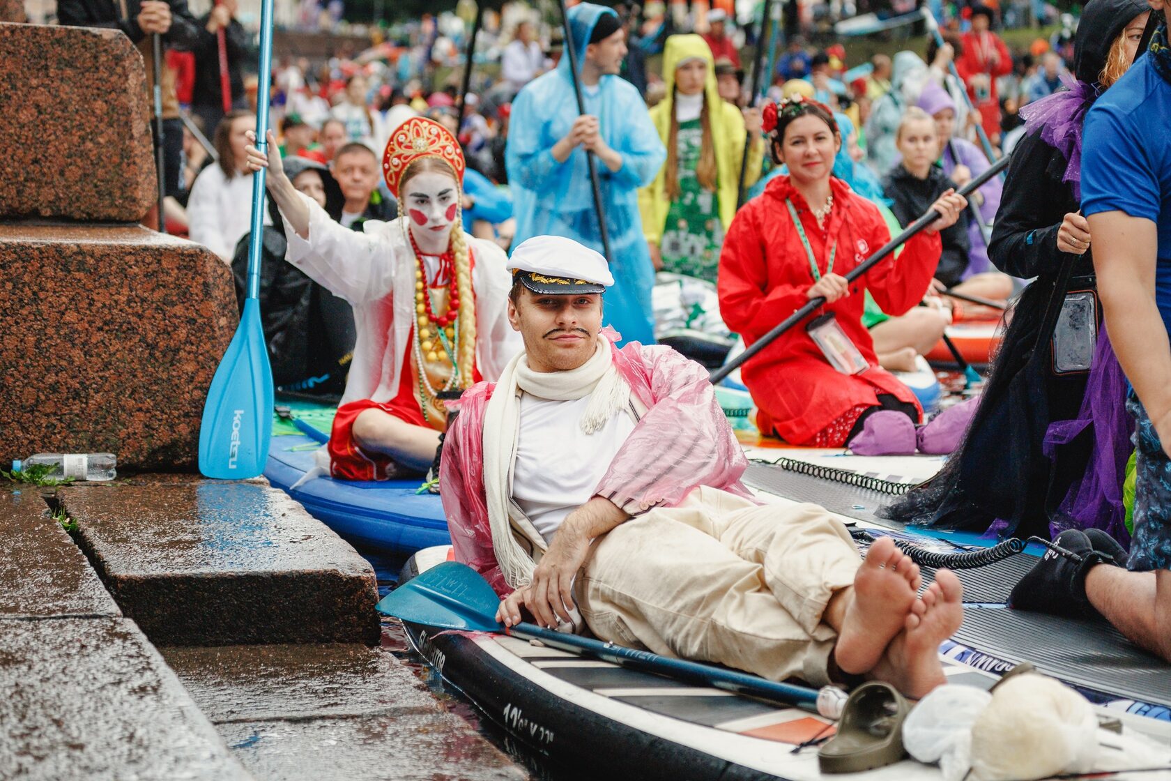 По традиции праздник начался еще на берегу Мойки у Марсова поля, где находится стартовый городок. Здесь участникам и гостям фестиваля надо было сфотографироваться в многочисленных фотозонах — начиная, конечно, с официальной юбилейной «Фонтанки SUP».