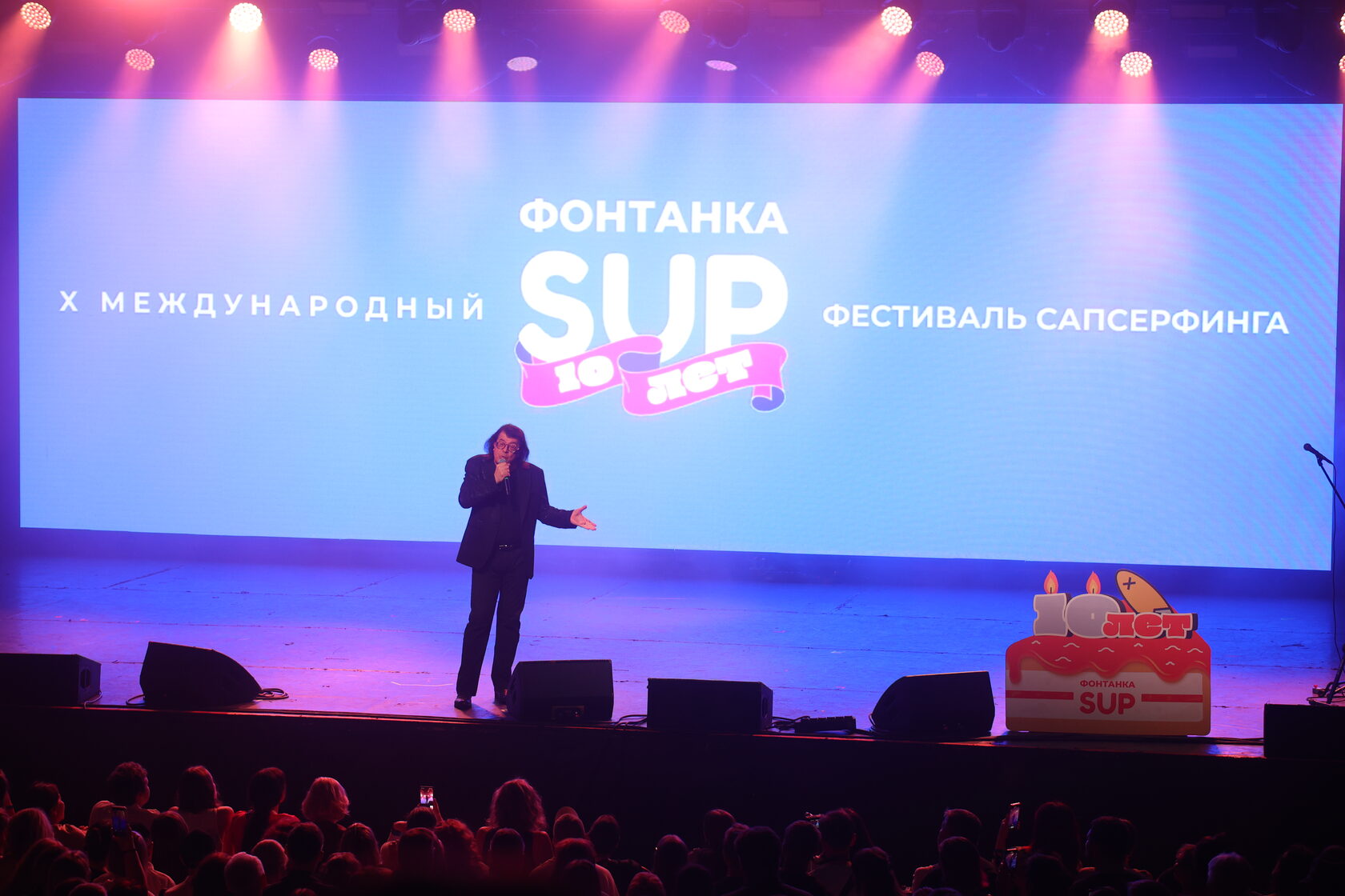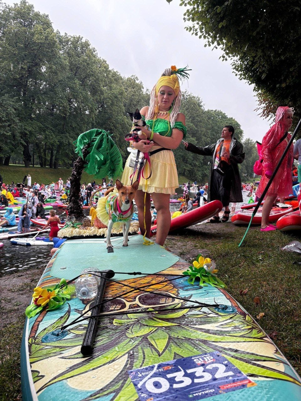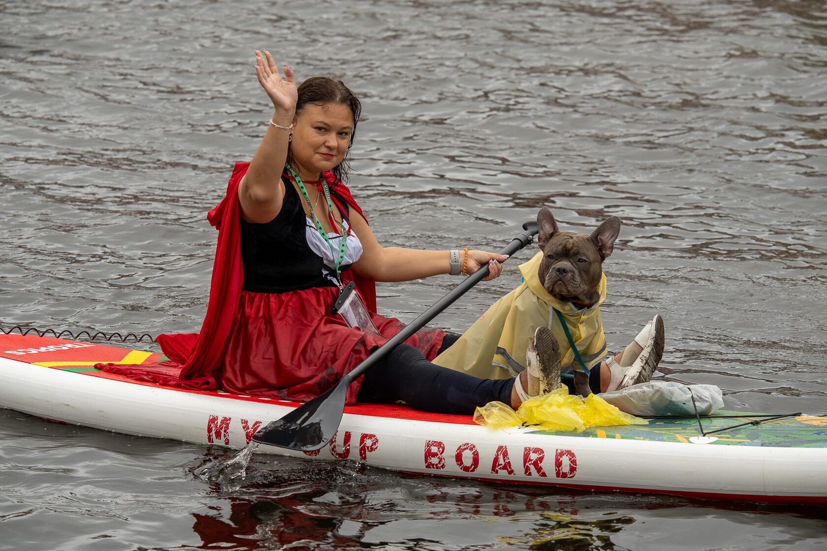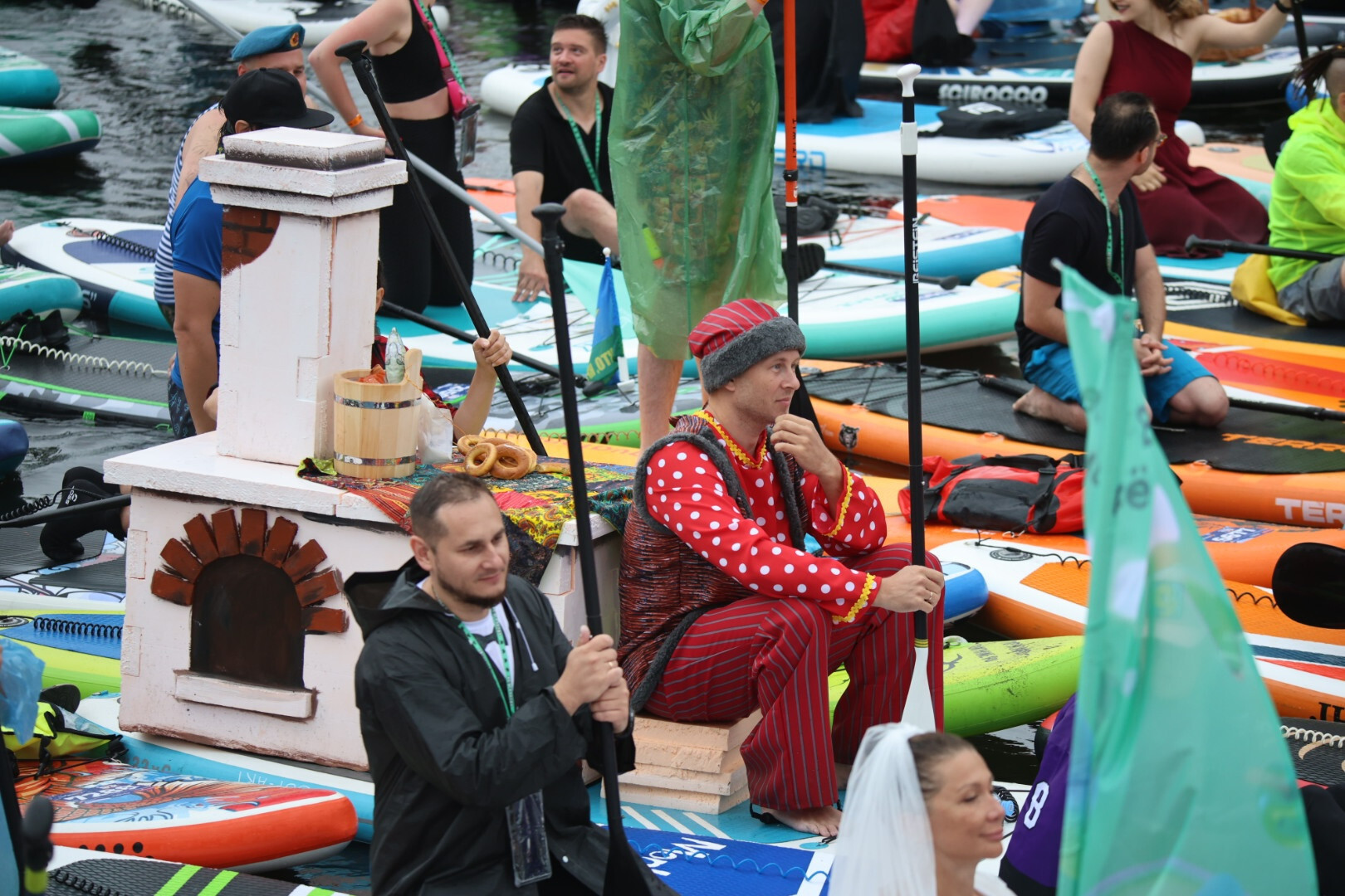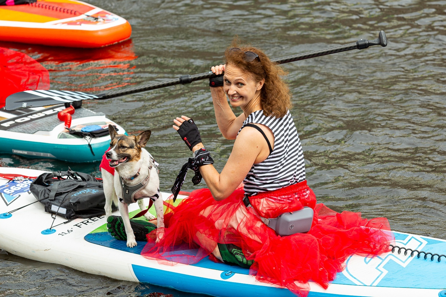 По традиции праздник начался еще на берегу Мойки у Марсова поля, где находится стартовый городок. Здесь участникам и гостям фестиваля надо было сфотографироваться в многочисленных фотозонах — начиная, конечно, с официальной юбилейной «Фонтанки SUP».