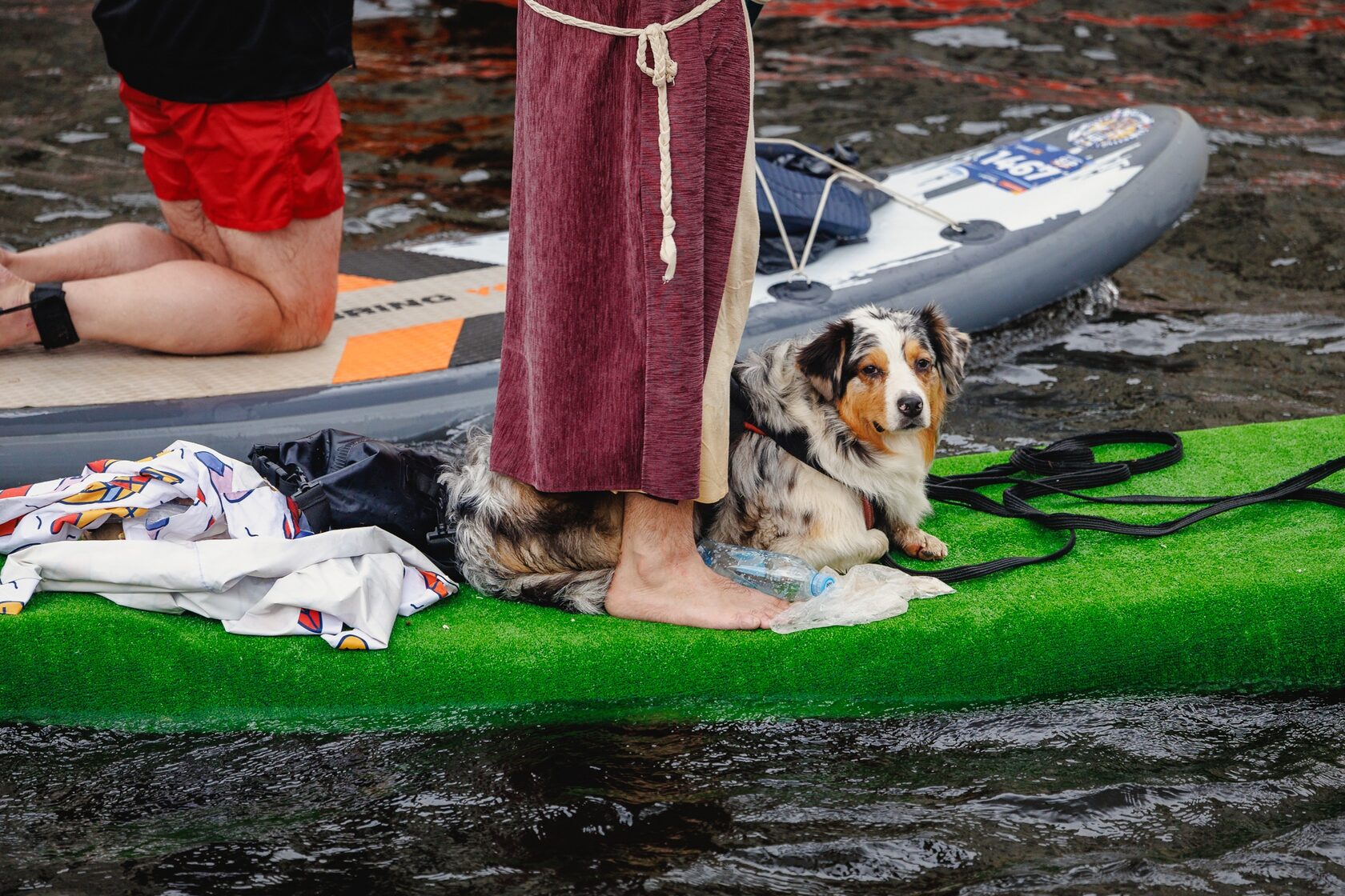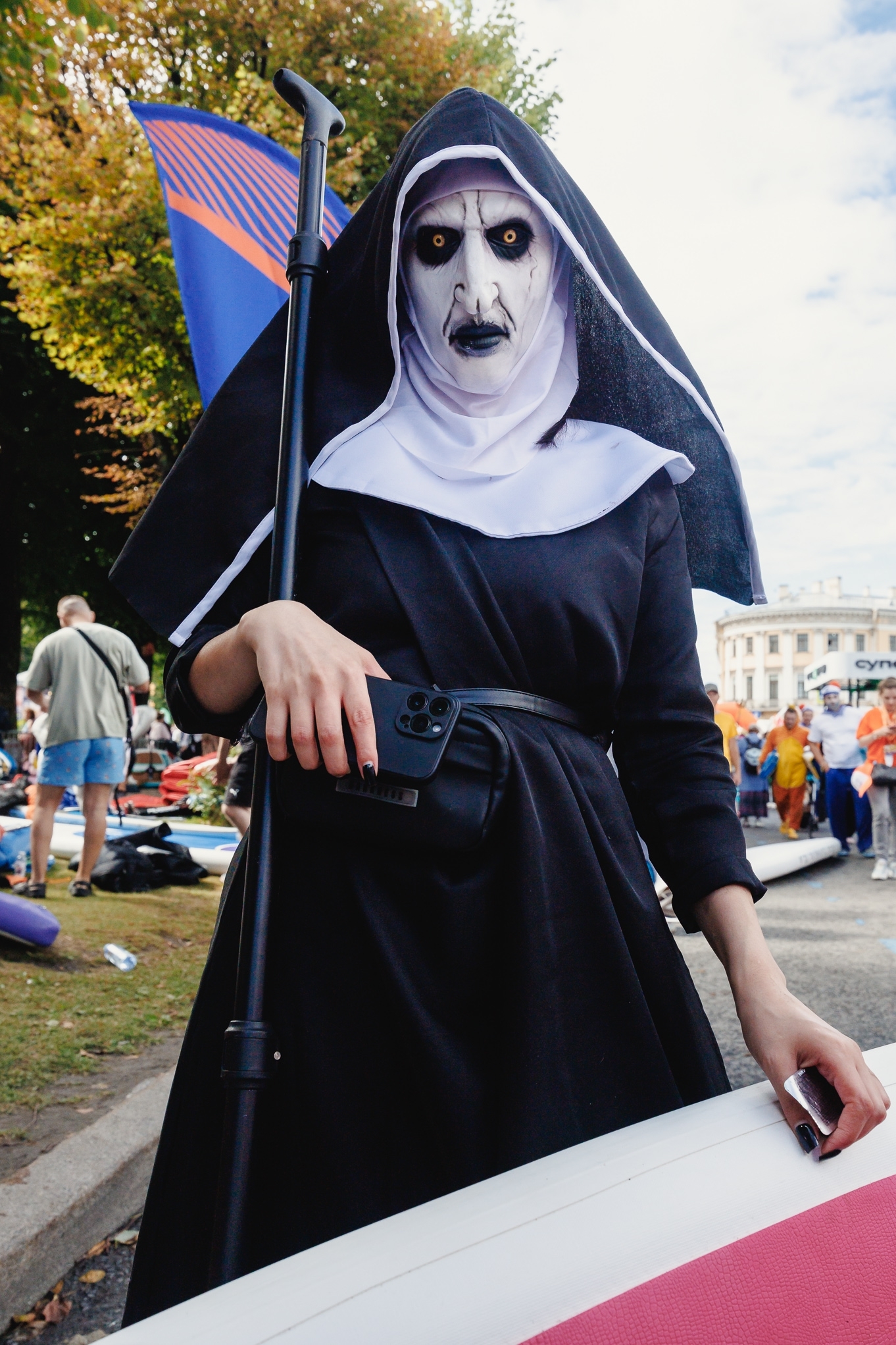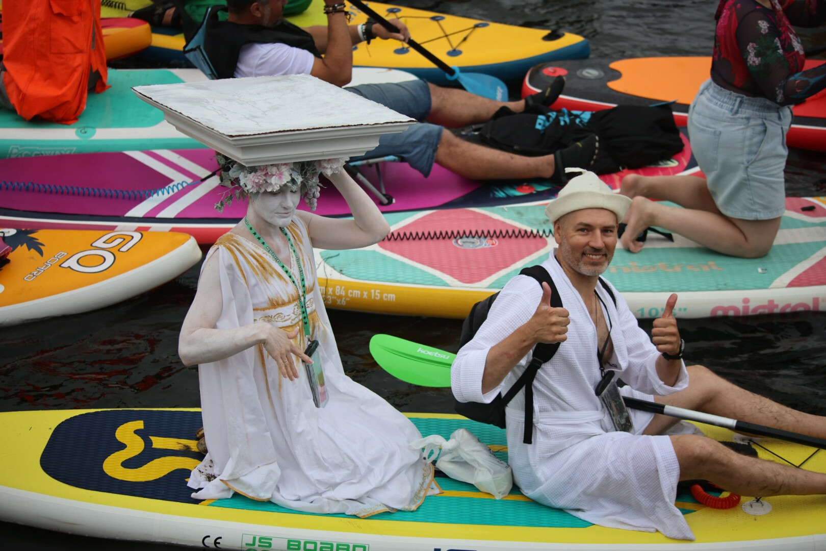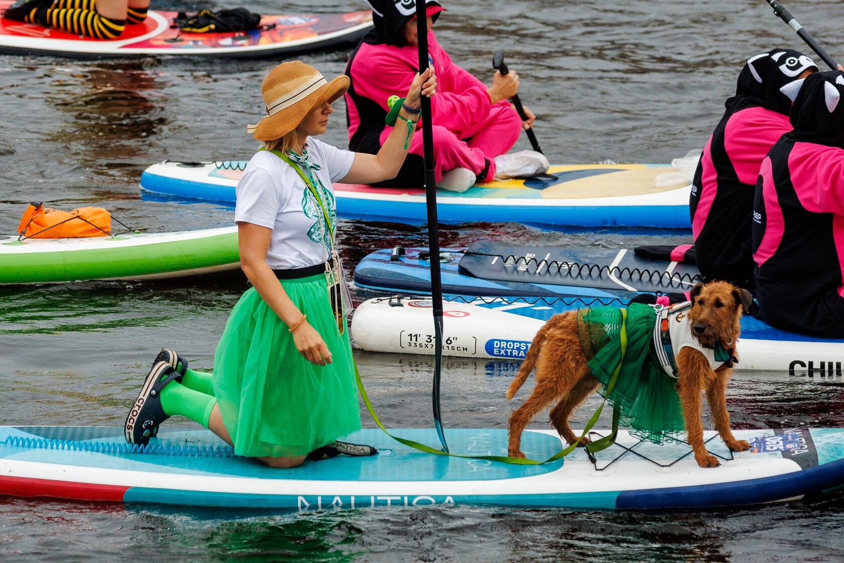 По традиции праздник начался еще на берегу Мойки у Марсова поля, где находится стартовый городок. Здесь участникам и гостям фестиваля надо было сфотографироваться в многочисленных фотозонах — начиная, конечно, с официальной юбилейной «Фонтанки SUP».