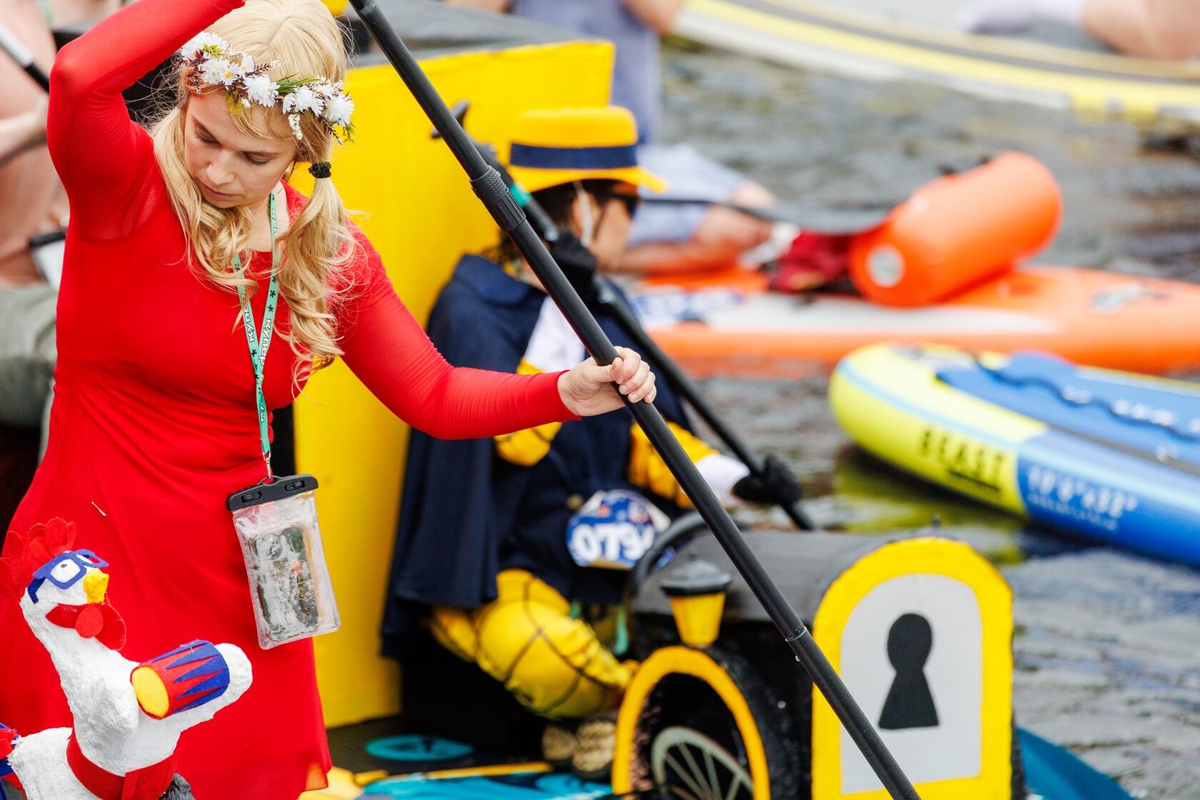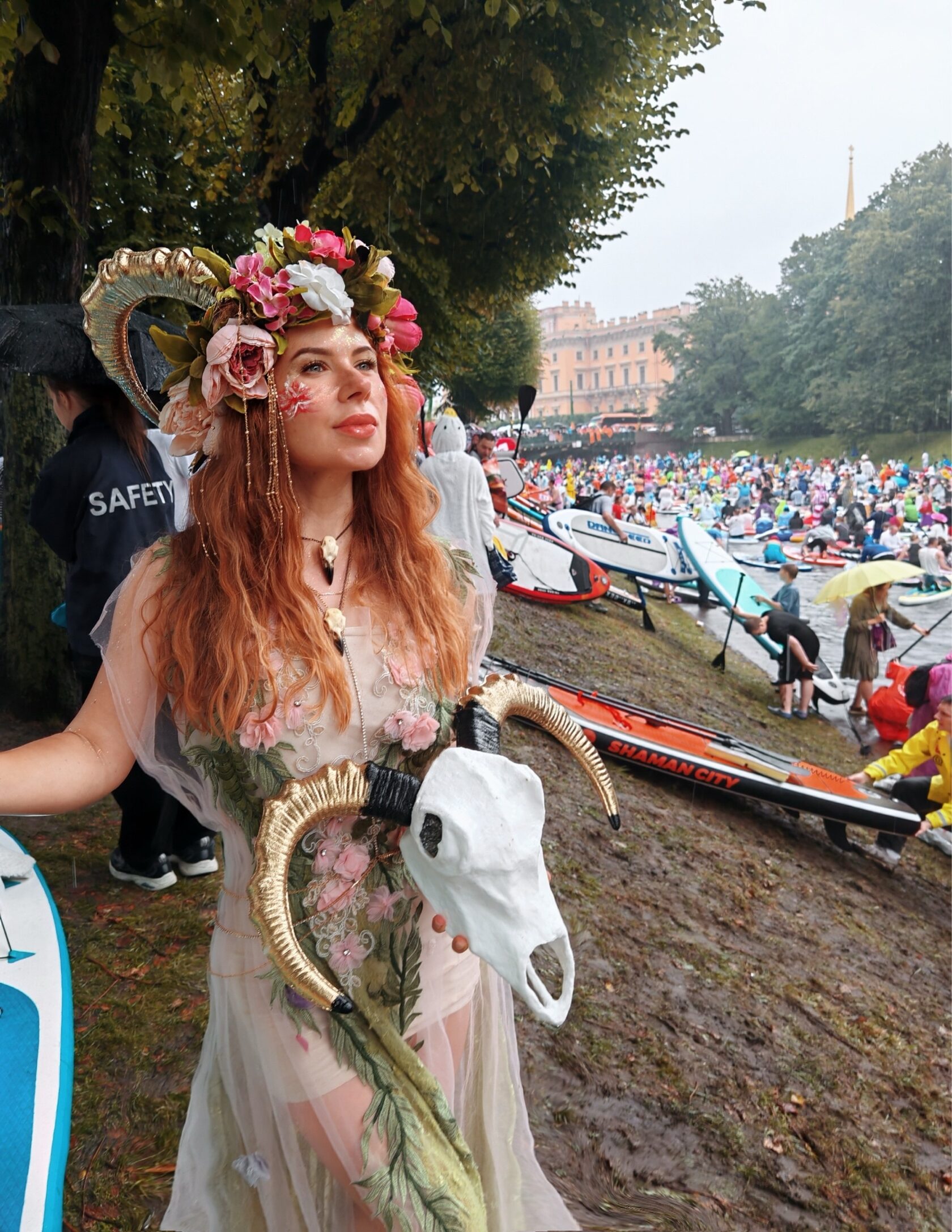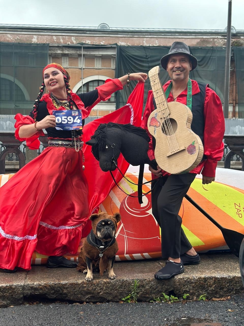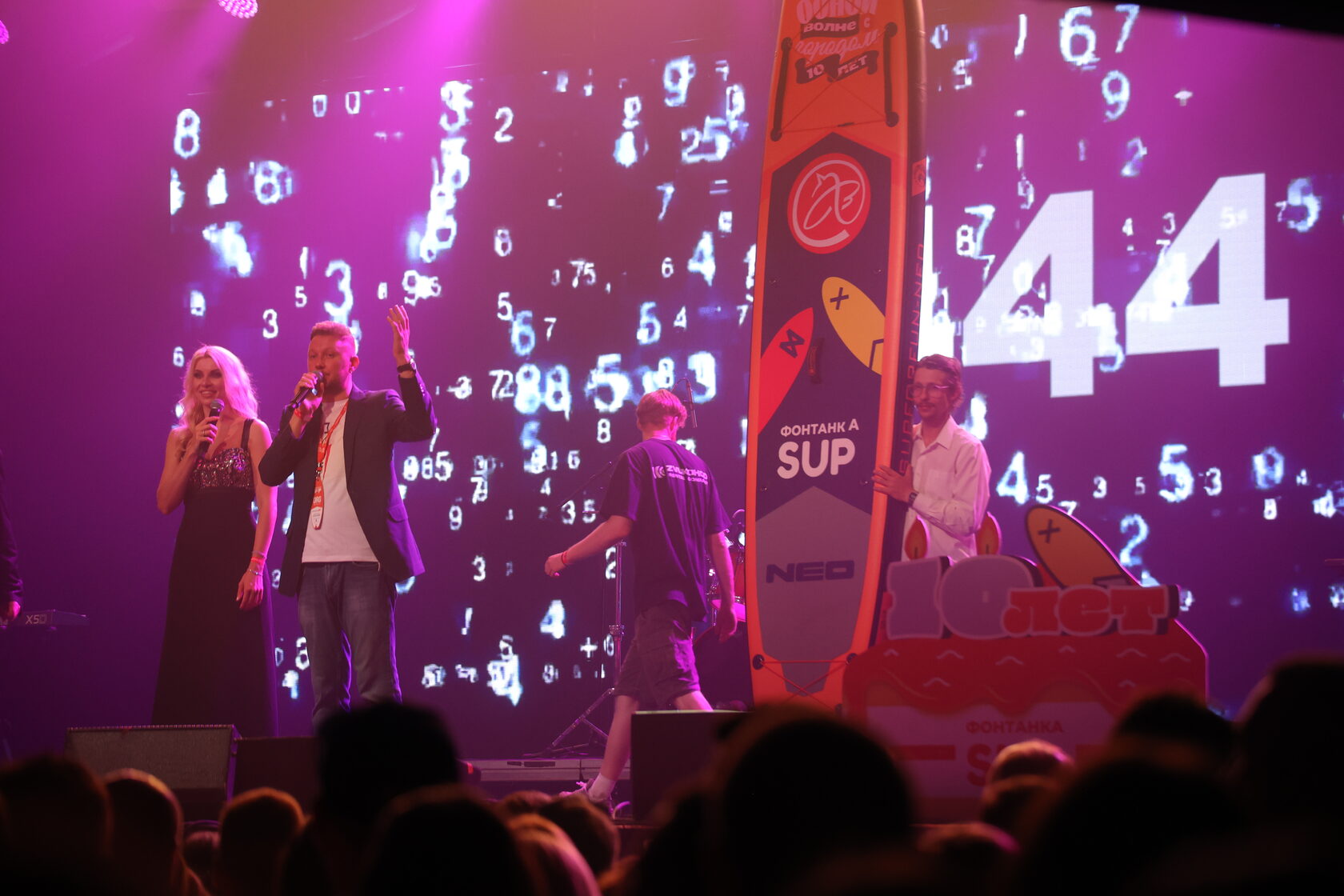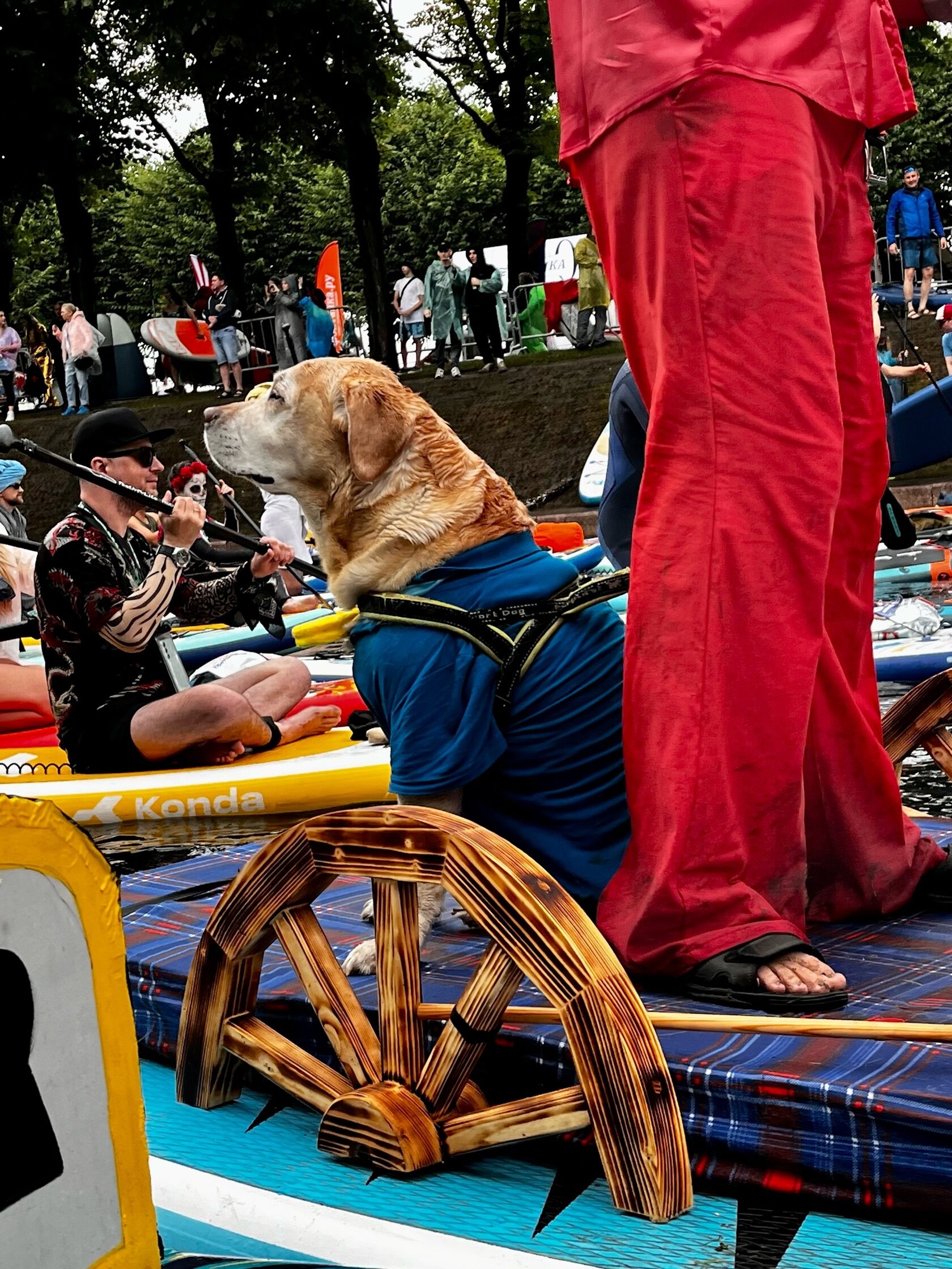 По традиции праздник начался еще на берегу Мойки у Марсова поля, где находится стартовый городок. Здесь участникам и гостям фестиваля надо было сфотографироваться в многочисленных фотозонах — начиная, конечно, с официальной юбилейной «Фонтанки SUP».